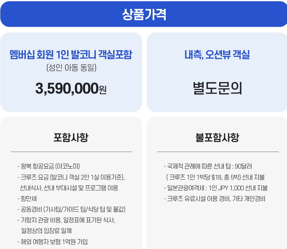 | 미정 | 일본 관광공사 면세점 방문 후 공항으로 이동 | 선내 조식후 체크아웃 | |