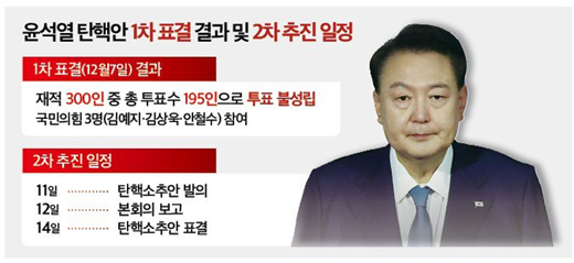 첫 번째 투표는 2024년 12월 7일에 실시되었습니다. 총 300명의 국회의원 중 195명이 찬성으로 표결에 참여하였으나, 불행히도 표결이 불성립되었습니다. 이 결과는 야당에게도 큰 충격으로 다가왔습니다.