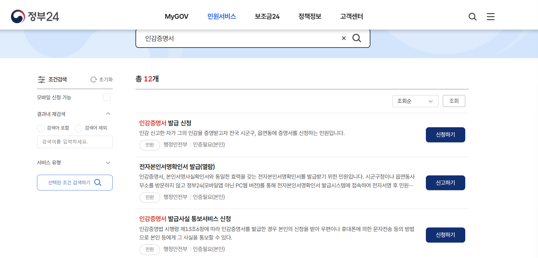 인감증명서가 시행된 이후에 100년 만에 온라인으로 발급하는 게 가능해졌다고 합니다. 네이버, 다음, 구글등과 같은 포털에서 정부 24를 검색하여 사이트 주소를 클릭 후 신청이 가 가능합니다