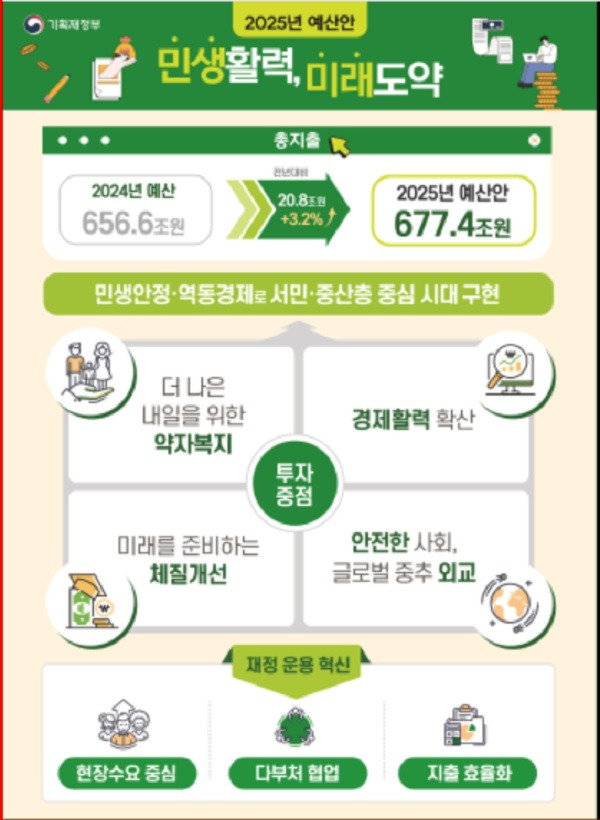 정부는 "민생활력, 미래도약"이라는 슬로건 아래, 2025년도 예산을 통해 국민의 생활을 더욱 향상시키고자 합니다. 이를 위해 지속 가능한 발전과 혁신적인 자원 관리를 강조하고 있으며, 현재의 필요를 우선시하는 정책을 추진하고 있습니다.